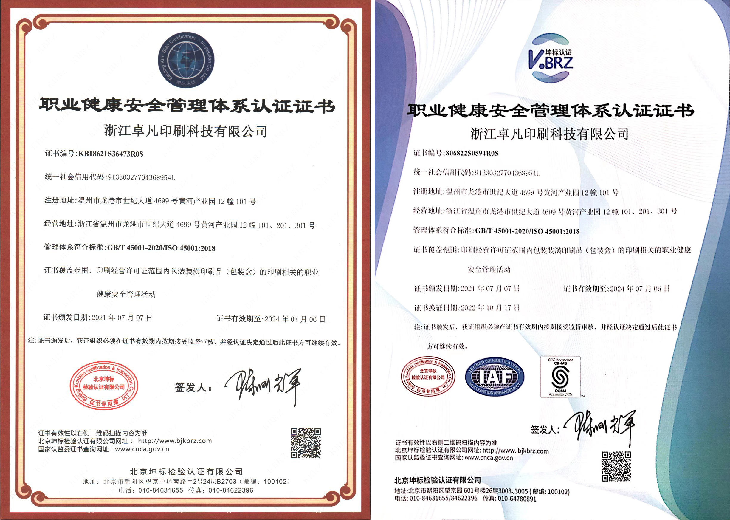 【 職業(yè)健康安全管理體系認證證書 】